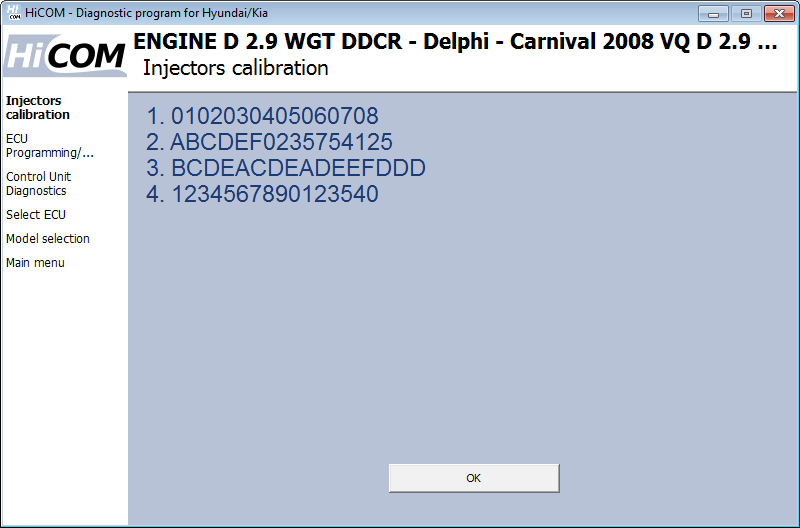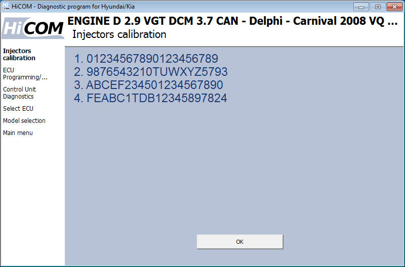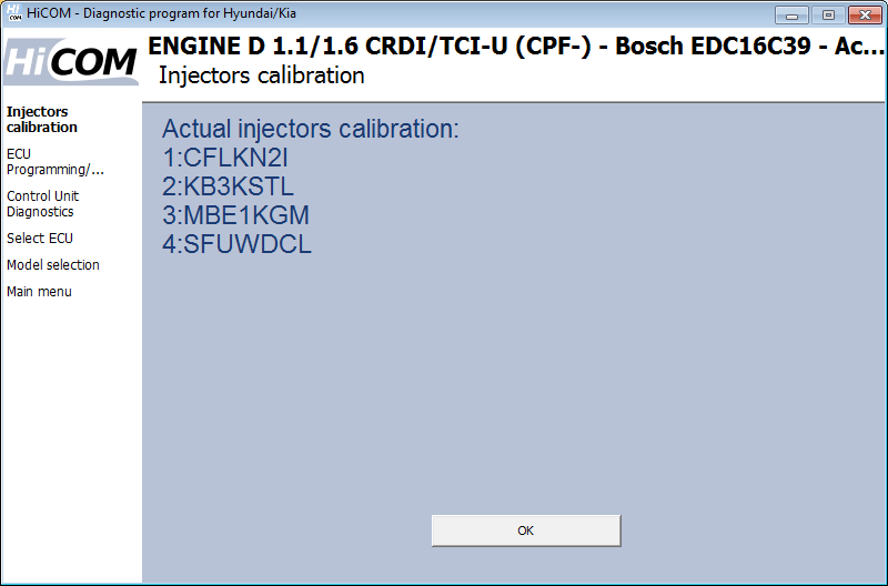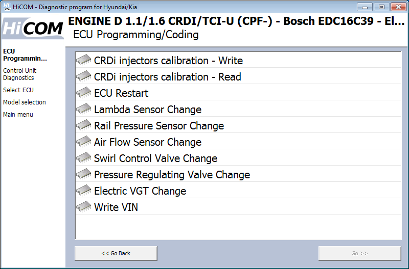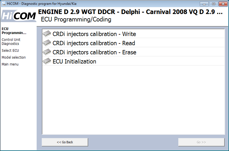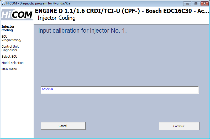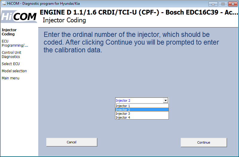 CRDi インジェクターのキャリブレーションは、ディーゼル エンジン コントロール ユニットに接続した後、プログラミング/コーディングメニューで利用できます。